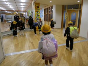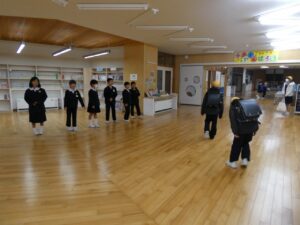 あいさつ運動 2025年11月11日 3年生, 東部っ子の1日 児童会の企画委員会の活動で、あいさつ運動を行っています。みんなに大きな声で笑顔のあいさつを広げたいという思いで、学校に来た人からみんなにあいさつを行っています。