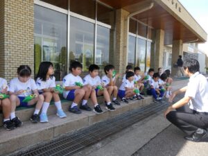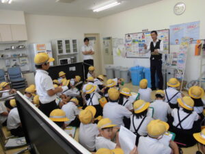 避難訓練(地震) 2025年9月22日 1年生, 2年生, 3年生, 4年生, 5年生, 6年生, 東部っ子の1日 地震が起きた時の避難訓練を行いました。子供たちは、揺れの音で机の下にもぐった後、揺れが収まってから防災頭巾をかぶり外に逃げました。今日は、県の防災士さんに避難の様子を見ていただき、講評をいただきました。