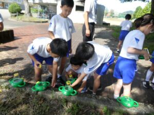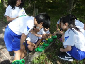 3の1 理科 虫の体の仕組み 2025年9月22日 3年生, 東部っ子の1日 昆虫拡大鏡に1匹虫を入れ、体の仕組みを観察しました。バッタやこおろぎ、ダンゴムシ、トンボなどを捕まえてじっくりと眺めて観察できました。