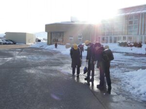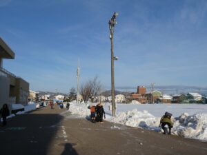 登校の様子 2026年2月4日 1年生, 2年生, 3年生, 4年生, 5年生, 6年生, 東部っ子の1日 今日の朝は、子供たちはいろいろ楽しんで登校してきたようです。まん丸の氷を手に登校する子、前庭の水が凍っている場所でスケートのように滑って楽しんでいる子、「雪の上、歩けたよ」と嬉しそうに話してくれる子など、たくさん報告してくれました。
