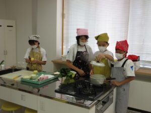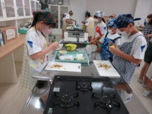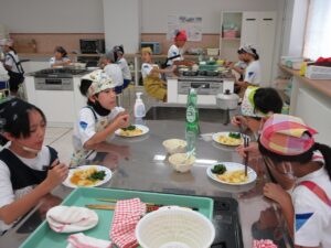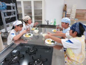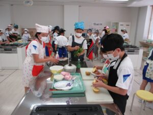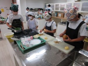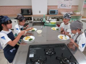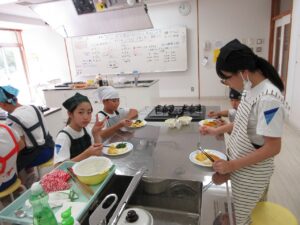 5年生 家庭科 ゆでる調理をしよう 2025年9月22日 5年生, 東部っ子の1日 久しぶりの調理実習でした。メニューは、「ほうれん草のおひたし」と「じゃがいものドレッシングがけ」です。今日は、じゃがいもの皮を包丁でむくことに挑戦しました。ドレッシングは簡単に作れます。ぜひ家で作ってみてほしいです。