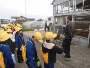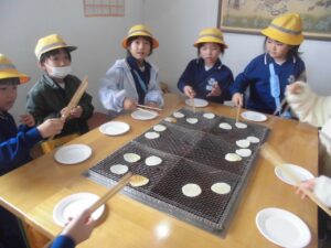 1,2年生 校外学習 2025年11月26日 1年生, 2年生, 東部っ子の1日 25日、1、2年生の生活科のすてき見つけで「ログログファーム」とささら屋に行ってきました。ログログファームでは、干し柿や玉ねぎ、ニワトリなど様々なものを育てておられるのを見てきました。ささら屋では、せんべいの手焼き体験と、店内の見学をしてきました。いろいろな種類のせんべいや米菓が売られているのを発見しました。