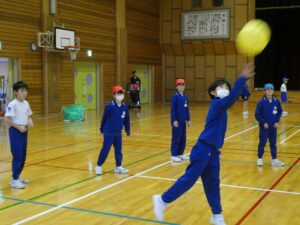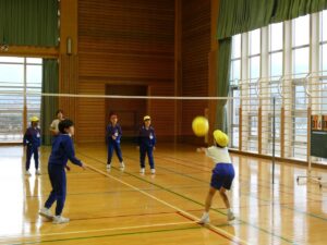 チームでボールをつなぎ、ネットを挟んだ相手チームに返します。子供たちは、声を掛け合いながらボールをつないでいました。