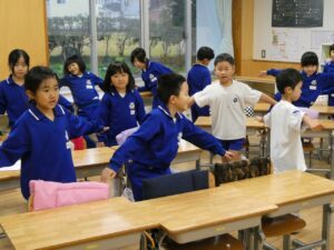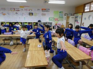 毎朝、簡単な運動を行っています。金曜日はT字バランスです。片足で上手にバランスをとっています。