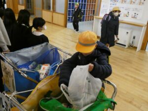 今日はボランティアーです。アルミ缶や牛乳パック、ベルマークがどんどん集まっています。明日も集めます。そして、あいさつ運動も続いています。1年生の大きな声のあいさつが響いています。