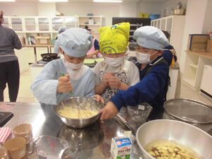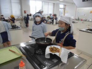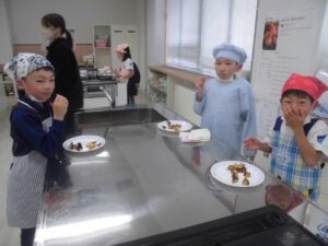 2年生 生活科 サツマイモパーティー 2025年12月11日 2年生, 東部っ子の1日 10月に掘ったサツマイモを使ってサツマイモのお菓子作りをしました。自分たちで計画を立てて調理をしました。作ったのは「サツマイモチップス」「大学いも」「カップケーキ」です。サツマイモが硬くて切るのが大変でしたが、おいしく食べることができました。