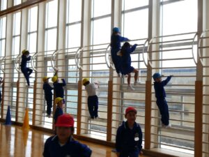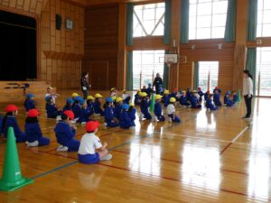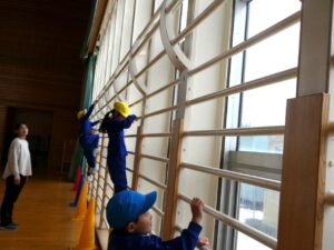 体つくり運動をしました。寒い体育館でしたが、途中から長袖運動服を脱いで半袖になる子供もいました。今日は肋木のぼりやフープ跳びなどを行いました。