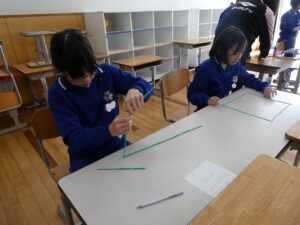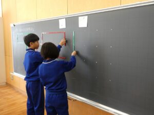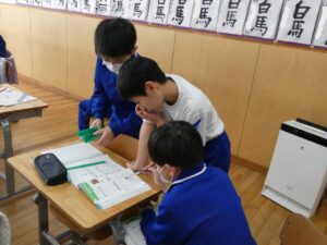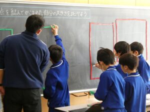 面積の学習です。広さの比べ方や表し方を考えました。新しい単位「平方センチメートル」も学習しました。