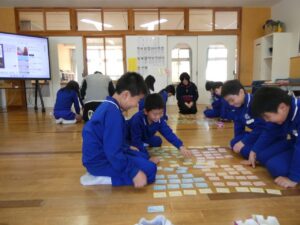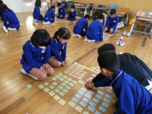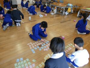 百人一首大会に向けて練習をしています。上の句を聞いて札をとれるよう、練習をがんばっています。