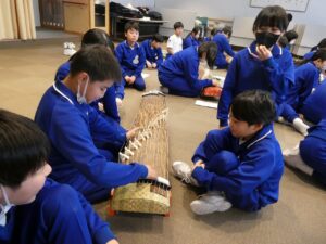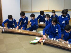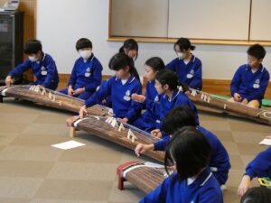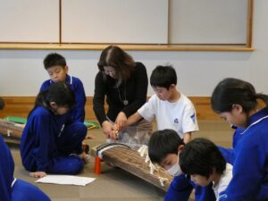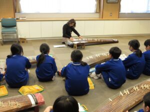 4・5年生 音楽 日本の音楽 2026年1月14日 4年生, 5年生, 東部っ子の1日 4年生「日本の音楽でつながろう」5年生「日本の音楽 触れよう」の学習で、校区にお住いの得能弘美さんに来ていただき、箏の演奏を聴かせていただいたり、箏の演奏の仕方を教えていただきました。子供たちは、実際に箏の音色の美しさを感じたり、「さくらさくら」を演奏したりして、箏に興味をもちました。