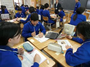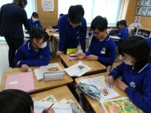 5年生 家庭科 2026年1月19日 5年生, 東部っ子の1日 冬休み中に自分が作ったみそ汁を紹介し、友達から感想を聞きました。家庭によってみそ汁の色も具もさまざまで友達の作ったみそ汁を興味をもって見ていました。