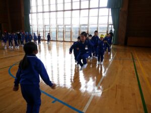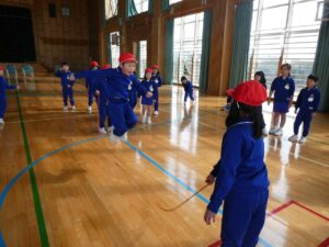 1・2年生 体育科 2026年3月10日 東部っ子の1日 各団に分かれ、「8の字跳び」の練習をしました。なかなか入ることのできない友達に声をかけたり、大きな声でみんなで数えたりして、たくさん跳べるよう頑張っていました。