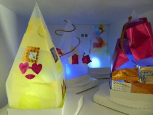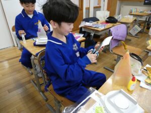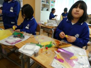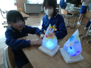 4年生 図画工作科 2026年3月10日 東部っ子の1日 透明容器と光を通す材料を組み合わせて「ゆめいろランプ」をつくっています。映る光の影の形や色、材料を切ったり重ねたりして、楽しんでつくっています。