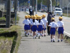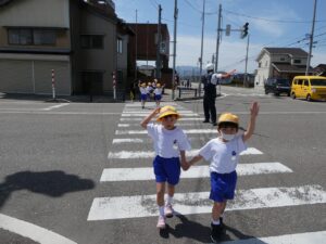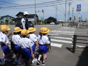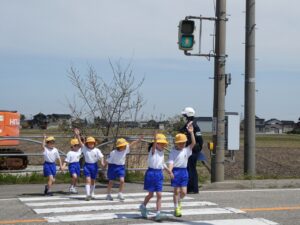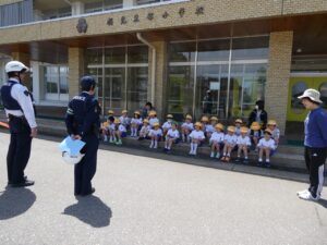 1年生 交通安全教室 2026年4月14日 東部っ子の1日 南砺警察署の署員の方におこしいただき、1年生の交通安全教室を行いました。道路の歩き方、信号の見方、横断歩道の渡り方などを教えていただきました。日中でも交通量が多い学校前道路です。交通安全に気を付けて登下校できるといいですね。