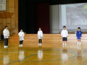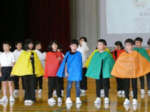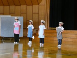 3年生 学習発表会練習 2025年10月10日 東部っ子の1日 3年生は、社会科の工場について学習したことを劇にした「製菓工場のひみつをさぐれ」です。43人で力を合わせて、工場の仕事の様子などについて発表します。