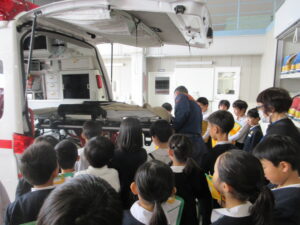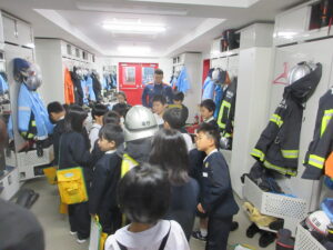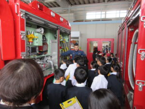 3年生は、社会科「火事からくらしを守る」の学習で、南砺消防署の見学に行きました。消防署では、119番の仕組みを教わったり、仕事の様子を見せていただいたりしました。消防車や救急車の中も見せていただき、消防の仕事に興味をもった子供もたくさんいました。