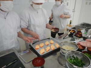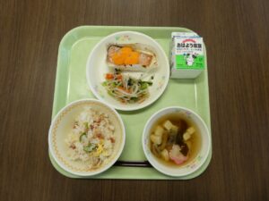 南砺市では、富山県食育推進月間に合わせて、11月の1週間を「な~んと! おいしい学校給食週間」として、地元農産物を積極的に使用した学校給食を実施しています。今日の献立は、『赤かぶのちらし寿司、なめこのすまし汁、さけのもみじ焼き、小松菜の和え物、牛乳』です。南砺市の食材は、米、赤かぶ、なめこ、にんじん、小松菜、玉ねぎ、しいたけ、牛乳です。2枚目の写真は、夏休み中に南砺市の調理員さんたちが献立を試作していらっしゃるものです。おいしくいただきました。