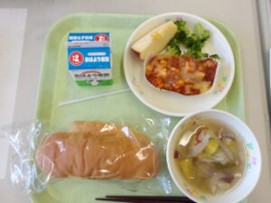 な~んとおいしい学校給食週間 3日目です。今日の献立は、『コッペパン、五箇山豆腐のミートグラタン、ブロッコリー、さつまいもスープ、牛乳、りんご』です。南砺の食材は、五箇山豆腐、南砺ポーク、にんじん、さつまいも、白菜、牛乳、りんごです。子供たちの大好きな手作りグラタンに、白菜とさつまいもの甘みを感じる温かいスープ。みんなでおいしくいただきました。
