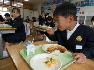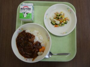 な~んとおいしい学校給食週間の4日目です。今日の献立は、『うしあかまるハッシュドビーフ、かぶとにんじんのグラッセ、カラフルサラダ、牛乳』です。南砺市の食材は、米、牛肉、大豆、にんじん、かぶ、牛乳です。おいしくいただきました。