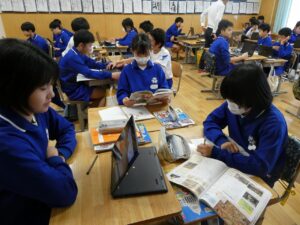 個々に調べ学習をしています。教科書、資料集、本、インターネット等で自分の課題について学びを深めています。