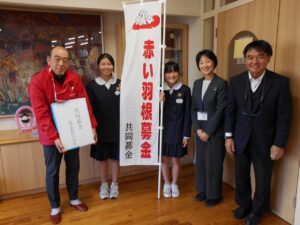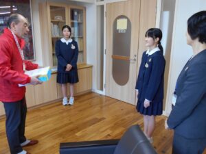 子供たちから集めた共同募金を、南砺市社会福祉協議会へ贈呈しました。地域の福祉活動へ有効に使っていただきたいです。