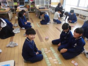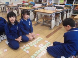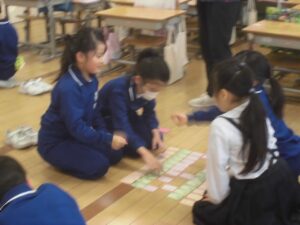 百人一首大会を行いました。冬休みに覚えてきた3色の札を、取り合いました。練習の成果を発揮して、上の句で取れる人も何人もいました。