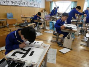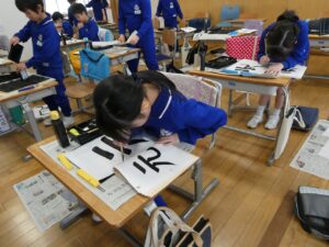 集中して毛筆で書いています。とめ、はねなどに気を付けて、力強く書きました。