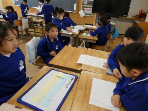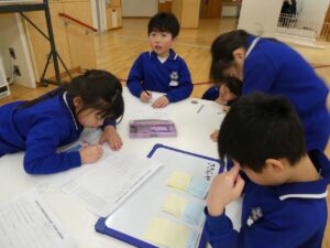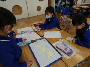 今まで出会った町のすてきを友達に伝えたい…と、まとめの学習をしています。1、2年生でグループになり、自分たちが見てきた場所、出会った人の『すてき』をたくさん出し合いました。何を伝えるかグループで話し合いながら学習を進めています。