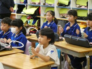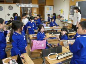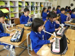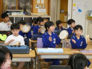 3拍子の拍を感じながら、「とんくるりん ぱんくるりん」を演奏しました。タンバリンとすず、鍵盤ハーモニカを使い、みんなで合わせて楽しみました。